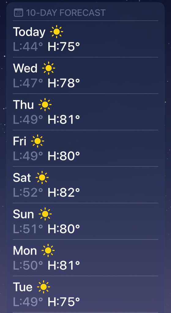I mentioned we head south from here. We’re heading toward our Pack members, my Mom and her husband, Bill, who were originally supposed to be with us for this adventure. They had a vehicle setback way back before we even got a chance to meet up with them, so it’ll be good to get the intended group back together. Especially in Texas Gulf Coast weather. Cross fingers. It would be nice to have some beach weather around the gulf before heading back North toward home in a few weeks. Back to all you poor souls who have been stuck in it. We’ve missed you. It’ll be nice to see NC folks again, even if we can’t wear shorts yet.
