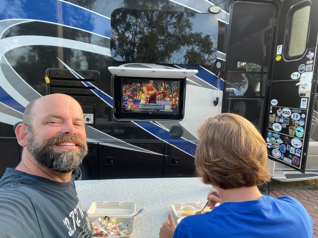 Turns out Galveston wasn’t our last gasp of shorts weather; we had a great stretch during our stay near Gulf Shores. Even had a pool day. We watched Duke lose it’s last regular season game and all of the ceremony of Coach K’s last game in Cameron on the inside and outside tvs. Then on they way home, we stayed at a couple of lovely little state parks, Chewacla, AL and Lake Hartwell, SC, for one night each. One night in V’s folks yard and then, bam, we were back home.